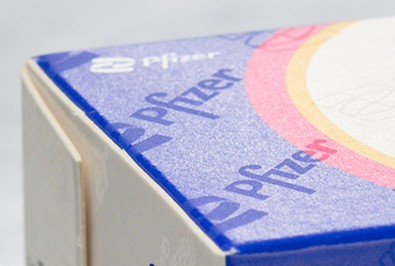 A cartonagem exterior tem uma camada sem cor e brilhante contendo um padrão repetido do nome e logo da Pfizer. O logo e nome da Pfizer aparecem num acabamento em mate contrastante.